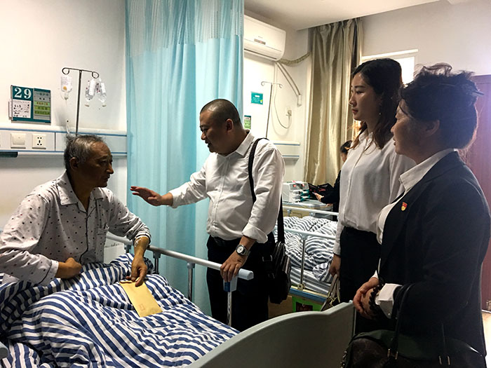 帶著燕興集團全體員工對身患疾病的金色春城項目主任、第二黨支部書記朱元金的關心,4月28日上午,燕興集團黨委、總公司、工會一行人,代表燕興全體員工,把燕興愛心慈善基金款中的5000元現金,送到了住在第五人民醫院的朱元金主任手中。對燕興物業有著深厚感情,病中還惦記著他負責的物業管理瑣碎事務的朱元金,很受感動,雙手抱拳連聲說著“謝謝”“謝謝”。