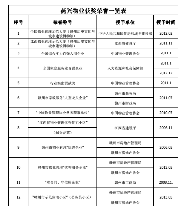 燕興物業(yè)近年來獲得榮譽證書及獎牌