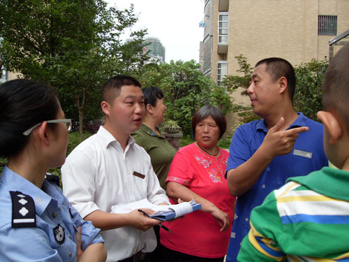 白鷺灣小區主任與社區民警一同向業主宣傳防災減災知識