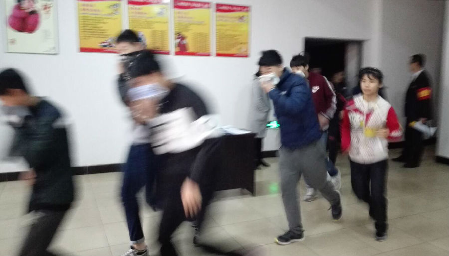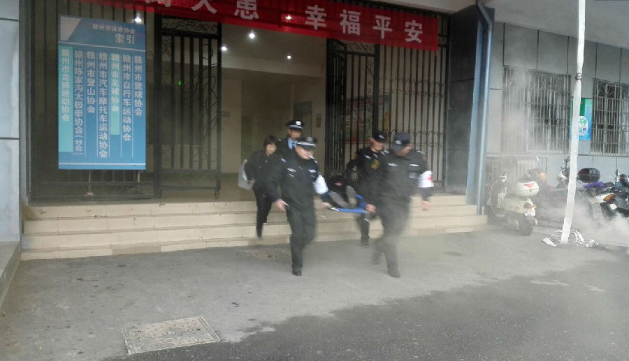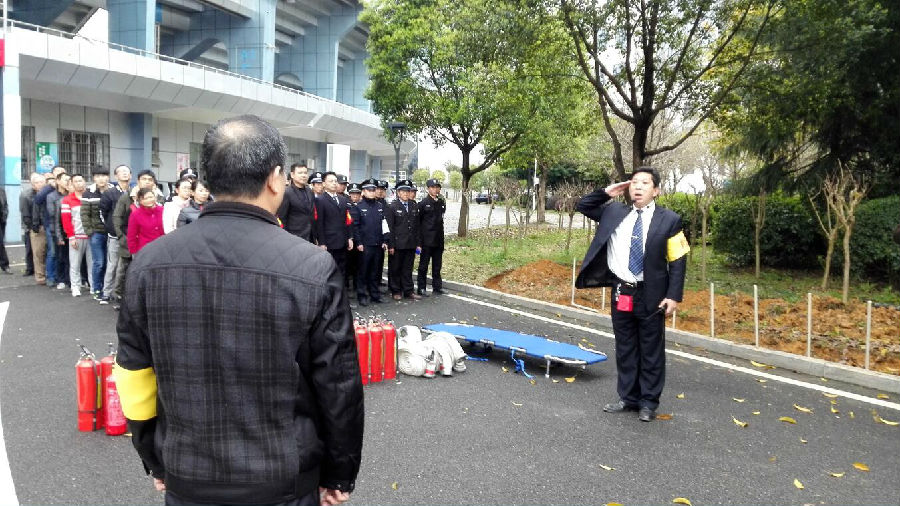 一培訓完,參加演練的全體人員整裝列隊,在演練總指揮的一聲令下,演練正式開始。這次演練的主要內容為通訊報警、警戒保障、疏散救護和行動滅火?,F場模擬體育中心某處冒出滾滾濃煙,物業公司接到火警報告后,立即啟動火災應急處置預案,通訊聯絡組、疏散警戒組、滅火行動組、后勤救護組按照預案立刻展開行動。通訊聯絡組立即撥打119、120救援電話;疏散警戒組立刻對各路口進行警戒封鎖,組織被困人員沿著設定的逃生路線有序撤出大樓;滅火行動組第一時間帶著消防水帶、滅火器等消防器材趕到火災地點,將大火有效控制直至撲滅;后勤救護組對在火災現場受傷的人員進行救護,傷情較重的用擔架抬出至安全地帶進行救治……各個環節臨危不亂,環環相扣,操作嚴謹。