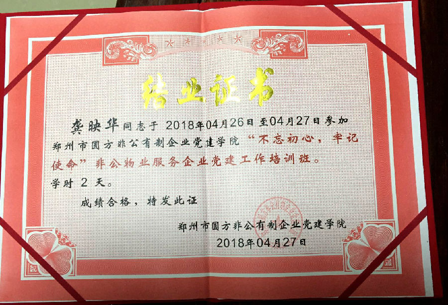 4月26日,150名來自全國各地的非公物業(yè)服務(wù)企業(yè)黨建工作者,在鄭州市圓方非公有制企業(yè)黨建學(xué)院進行為期兩天的黨建工作專題培訓(xùn)。燕興物業(yè)黨委專職黨務(wù)工作者龔映華參加培訓(xùn)。