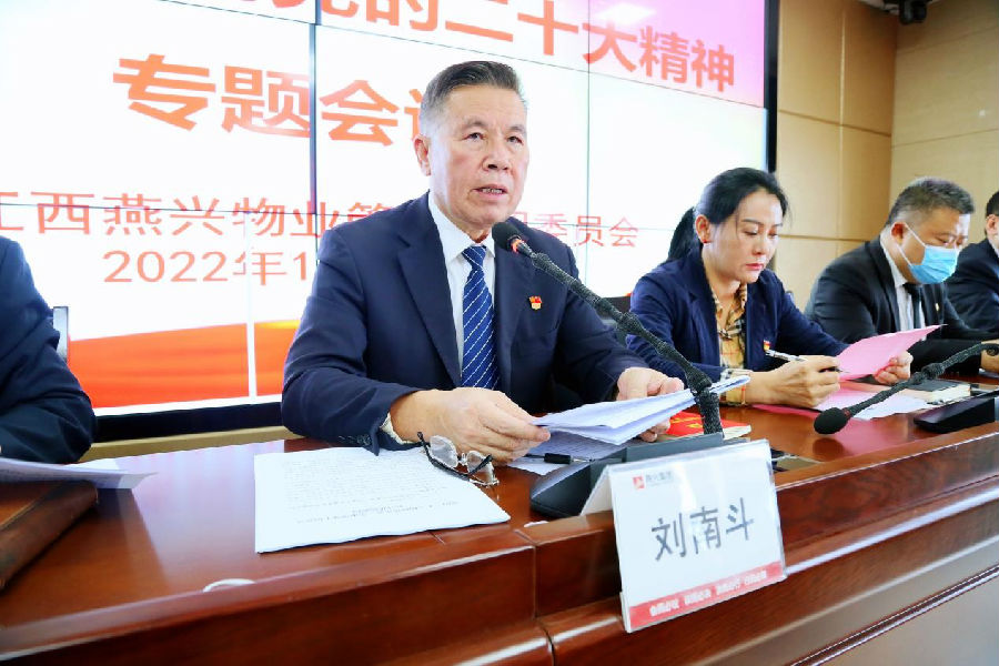 11月18日下午,燕興集團黨委召開學習宣傳貫徹黨的二十大精神專題會議。集團黨委書記、副總裁劉南斗主持會議,集團黨委委員、公司領導、贛州中心城區各支部黨員、入黨積極分子、各項目管理人員及公司各職能部門負責人參加。