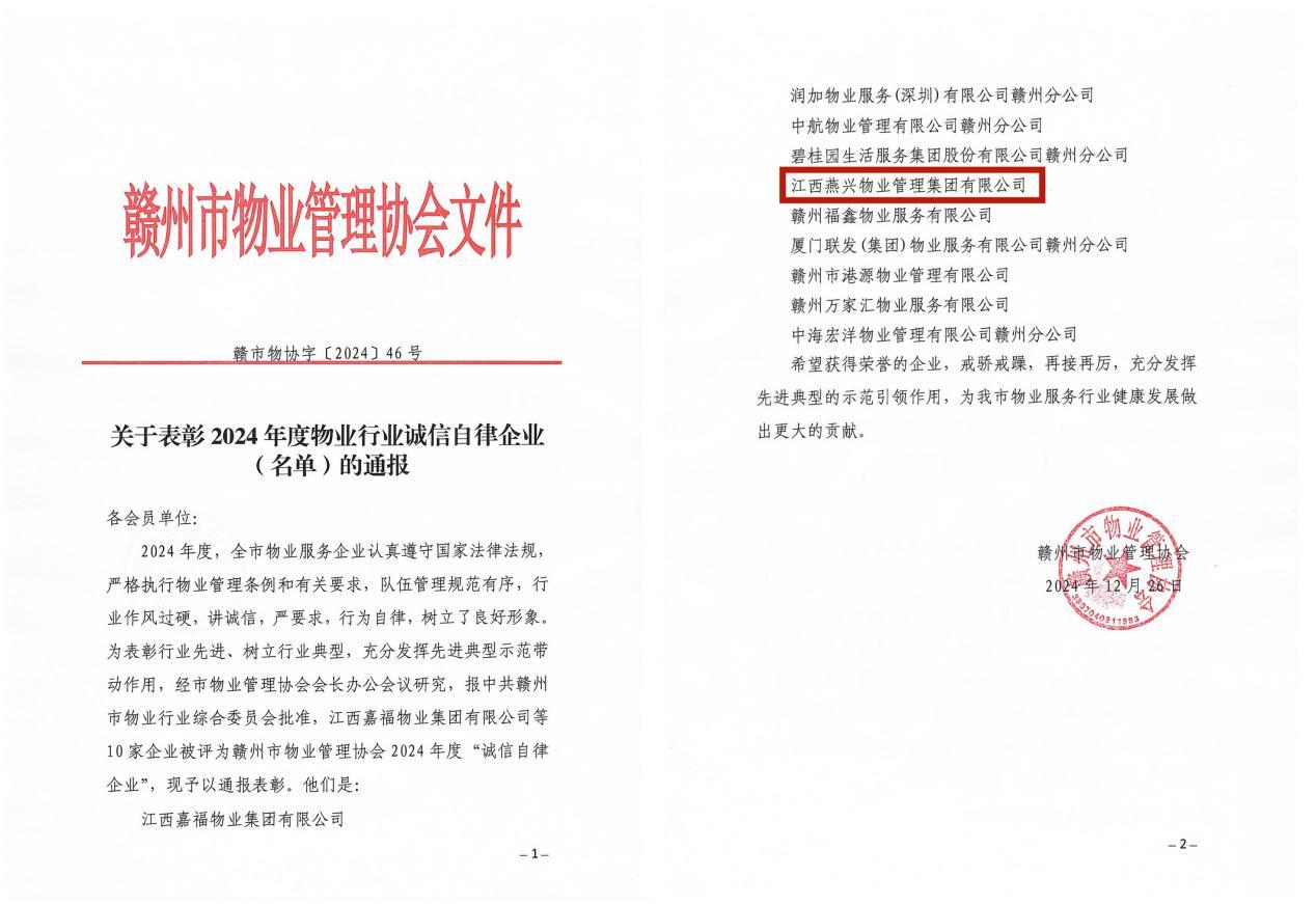 喜報|燕興物業(yè)榮獲“2024年度優(yōu)秀物業(yè)企業(yè)”“誠信自律企業(yè)””支持文明城市創(chuàng)建先進企業(yè)”榮譽稱號