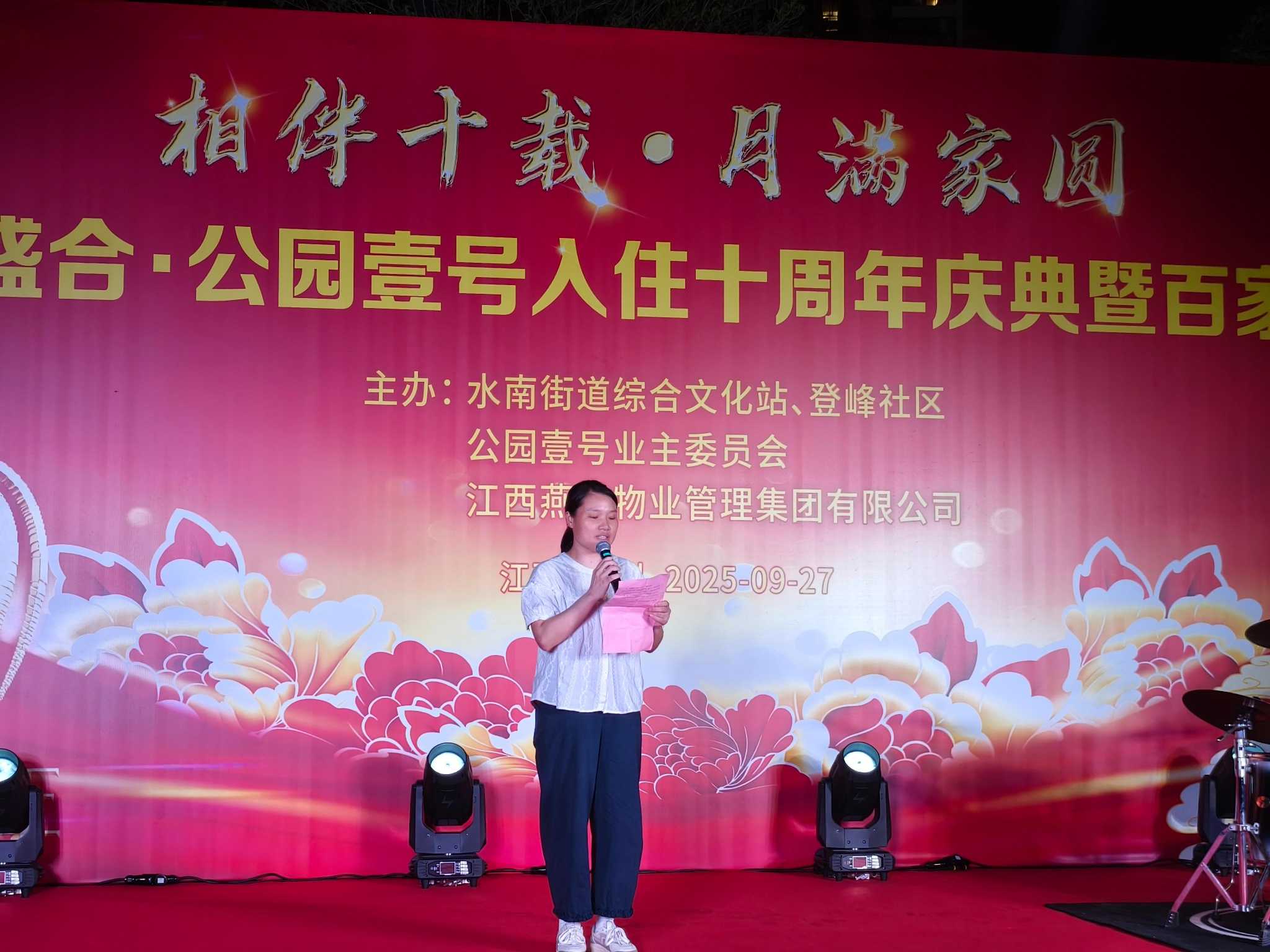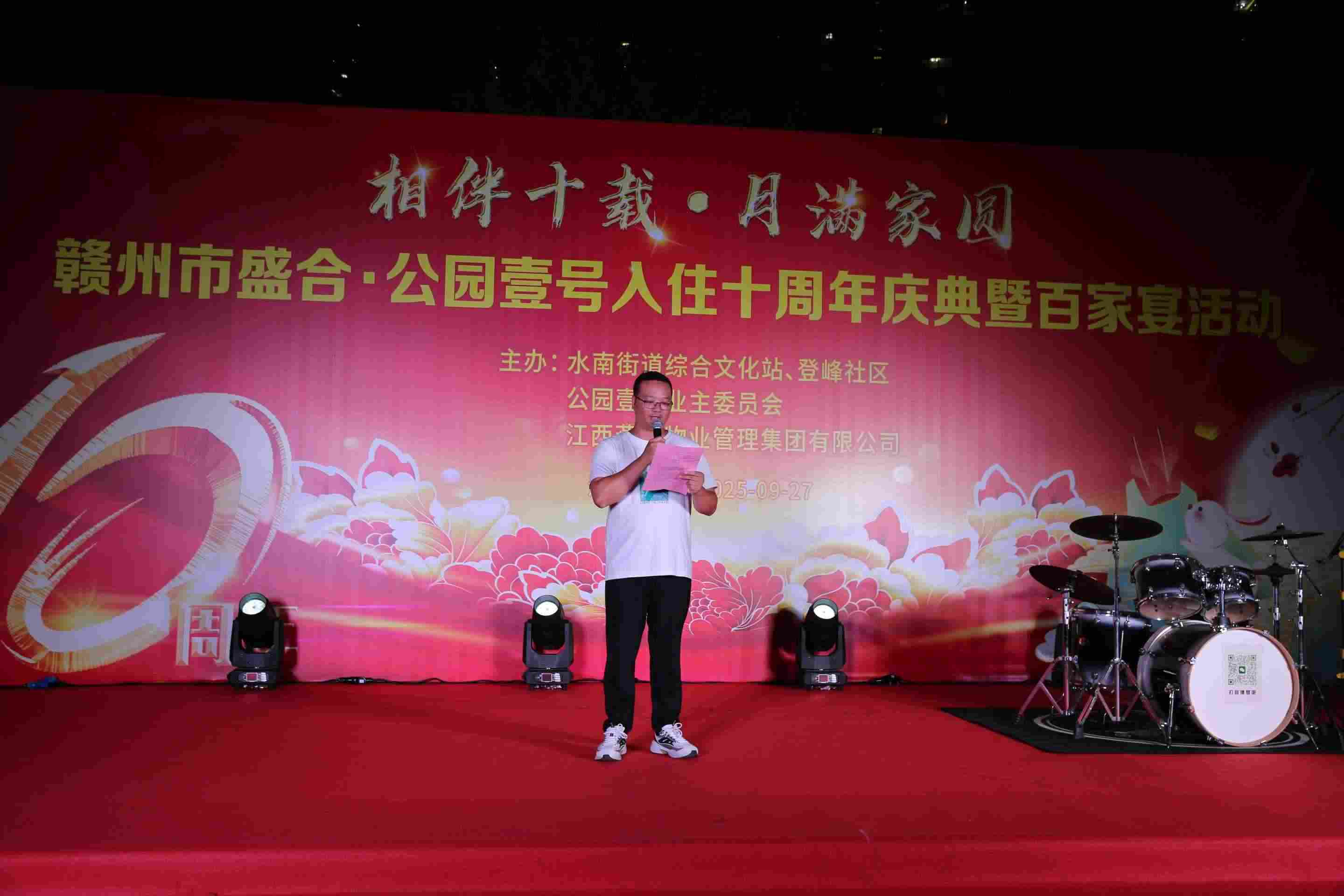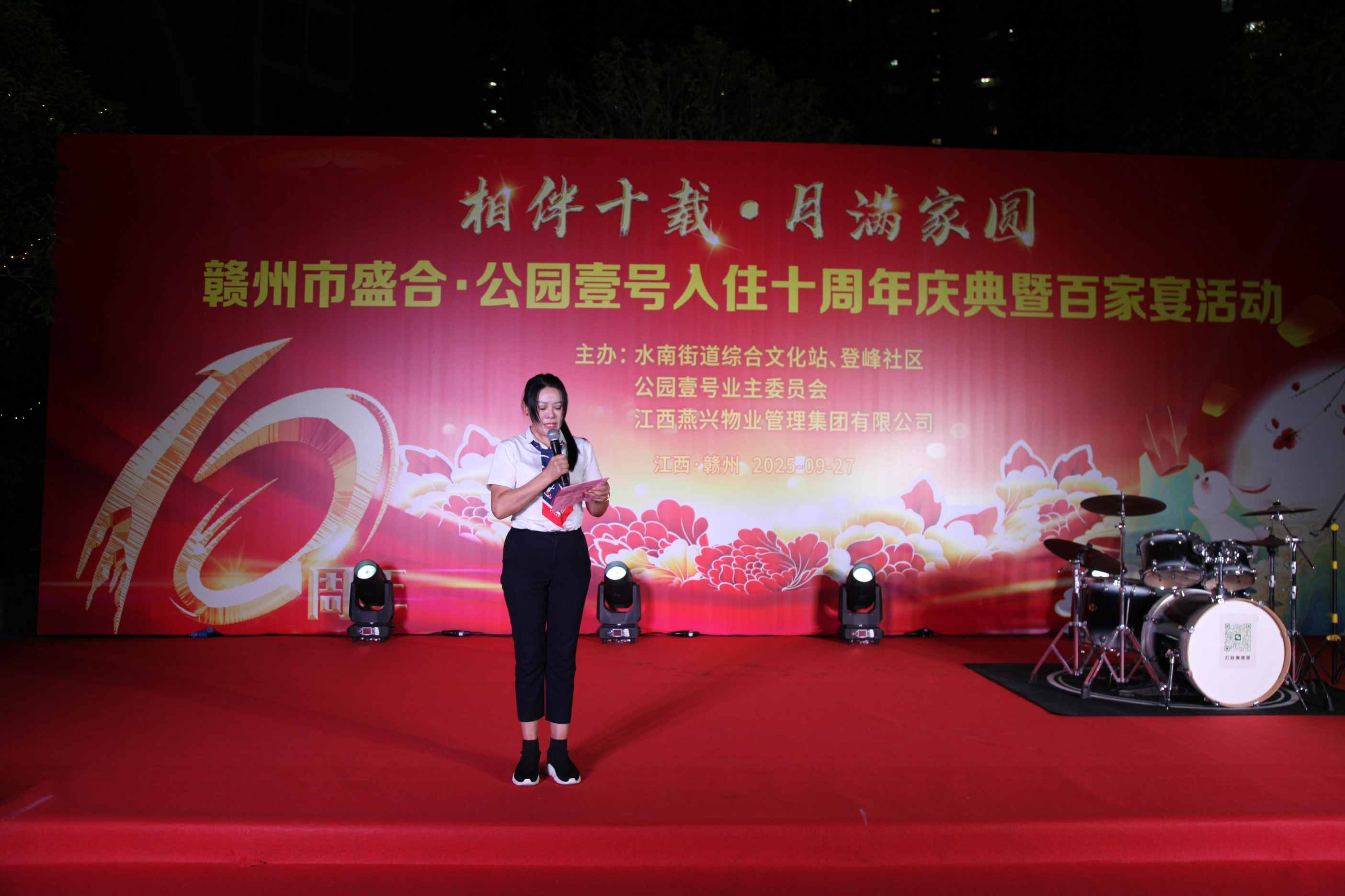 金秋送爽,丹桂飄香。9月27日晚,章貢區(qū)水南街道登峰社區(qū)盛合·公園壹號小區(qū)張燈結彩、歡聲笑語,一場以“相伴十載·月滿家圓”為主題的業(yè)主入住十周年慶典暨百家宴活動溫馨上演,燕興物業(yè)集團代表和數百名業(yè)主代表歡聚一堂,共敘十年鄰里深情。