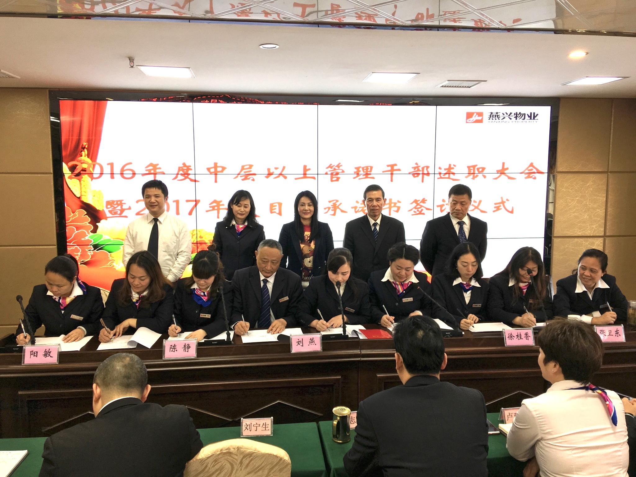 2017年2月17日,江西燕興物業(yè)管理公司在公司大會(huì)議室召開2016年度中層以上管理干部述職大會(huì),及舉行2017年度目標(biāo)承諾書簽訂儀式,公司董事長劉燕,總經(jīng)理劉南斗,常務(wù)副總經(jīng)理陳靜,副總經(jīng)理徐桂香、陽... 2017-02-18